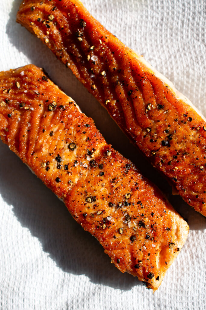 The seared salmon is all about technique. Patting it dry and letting it come to room temperature helps it sear beautifully. A quick five minutes skin-side down in a hot pan gives you that golden, crispy texture, while a few more minutes on the other side finishes it off without drying it out.