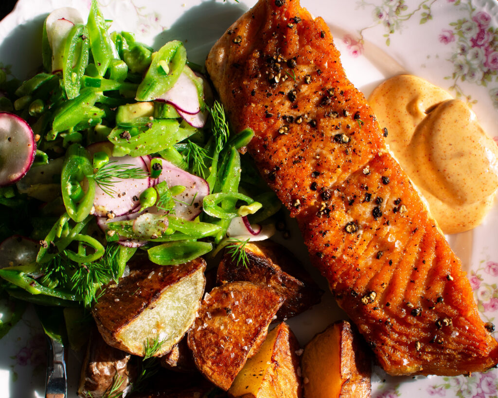 - Plate the salmon with the potatoes, snap pea salad, and spicy mayo alongside.