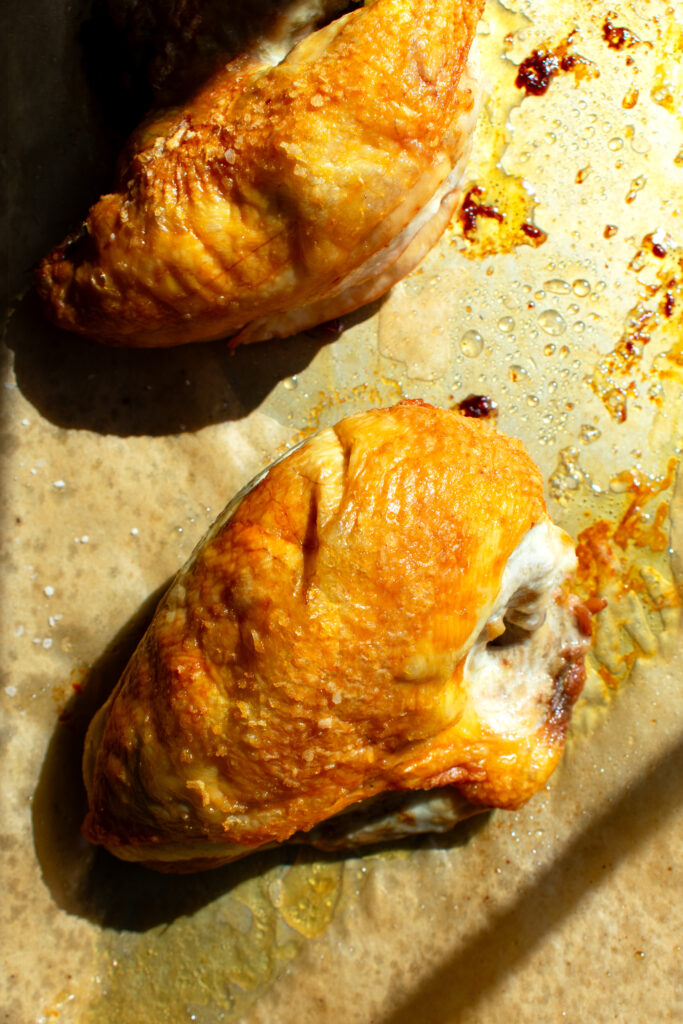 2. Prepare a sheet pan with parchment paper. Place the chicken onto the pan and coat it with olive oil. Season well with salt. Roast the chicken, skin side up, for 40-50 minutes, or until fully cooked through. Remove the chicken from the oven and allow it to sit until it’s cool enough to handle.