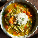 7. Ladle the soup into bowls. Top with a dollop of creme fraiche, fresh dill, flaky sea salt, black pepper, and a drizzle of olive oil.
