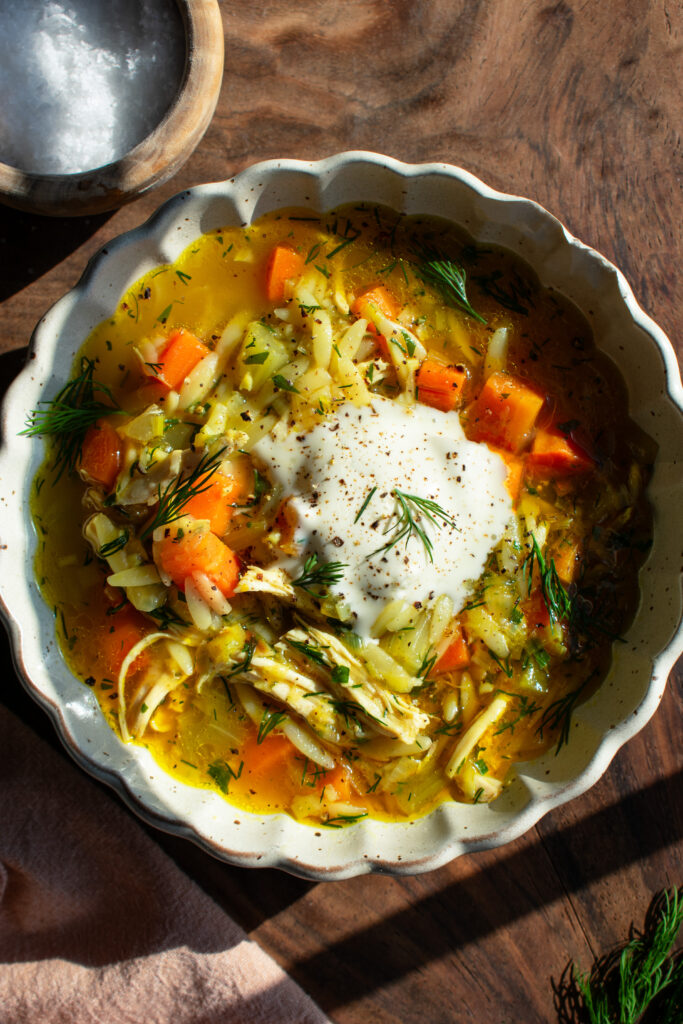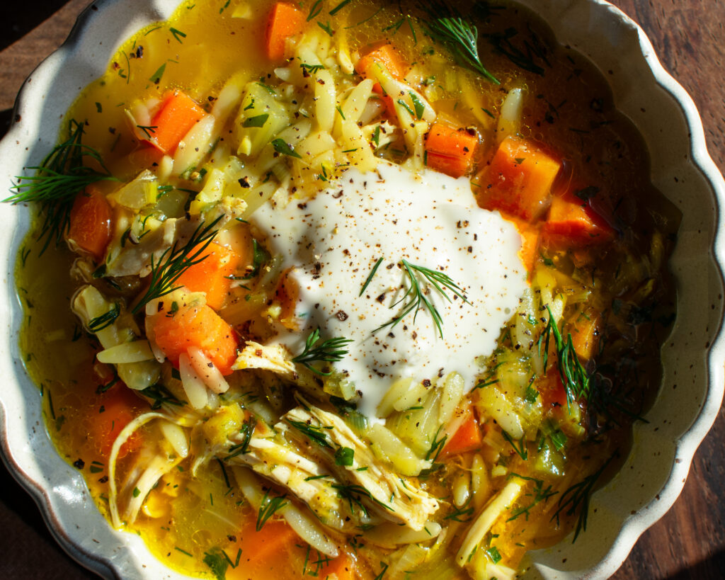 a bright, herby chicken & orzo soup topped with a dollop of creme fraiche
